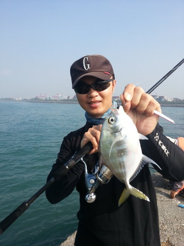前兩天下雨的關係,心想水應該還是濁的,今天就帶著海鱸竿玩Light jigging,輕鬆釣就好,沒想到狀況奇差無比,只好和朋友邊聊邊釣,沒想到中了一尾好料瓜,只不過太咪了,請朋友拍完照趕快放回去。也算一個新郵票,俗名好像叫銅鏡鰺?!~~~